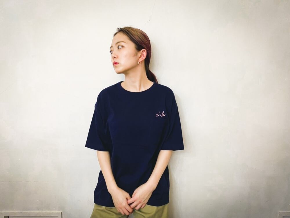 ポケット付きのTシャツに「aLife」の刺繍入り ネイビー×ピンク刺繍 モデル身長 男性177cm(XL) 女性(ロング)156cm(S) 女性158cm(L) Here people overseas! https://www.tenso.com/en ※商品の到着まで10日前後頂いております。